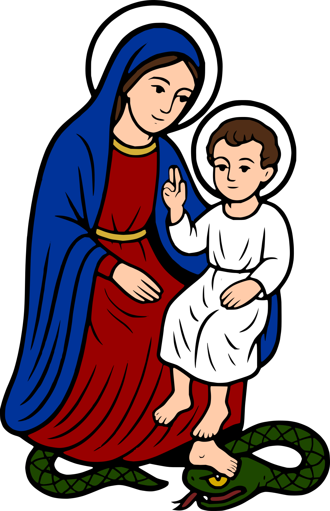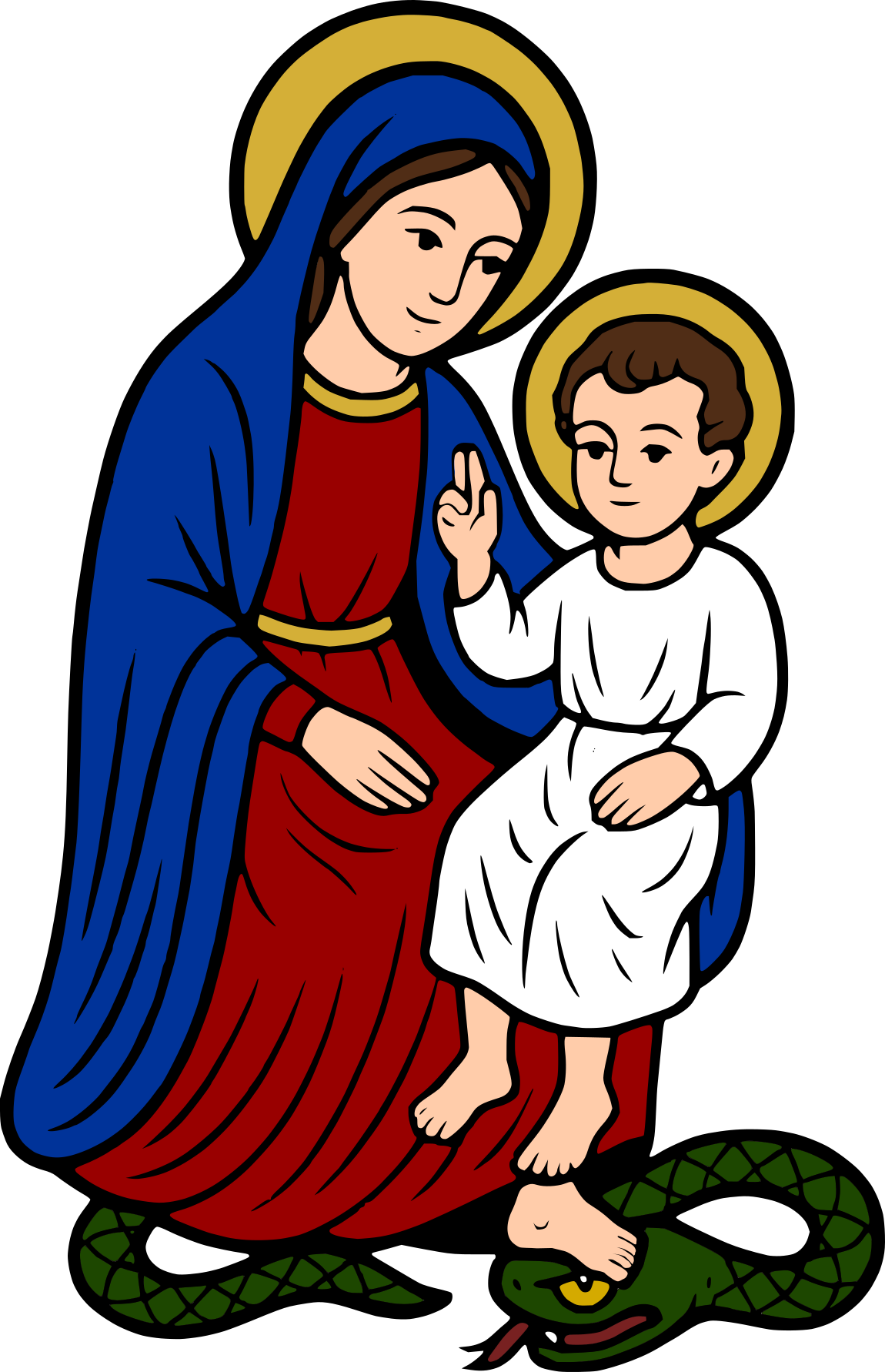 Mary, the mother of Jesus, is shown with her foot upon the serpent, while the Christ Child places His foot upon hers. This composition symbolizes that the power conquering evil comes from Christ Himself, yet His Mother shares uniquely in that victory through her faithful cooperation with God's saving plan.